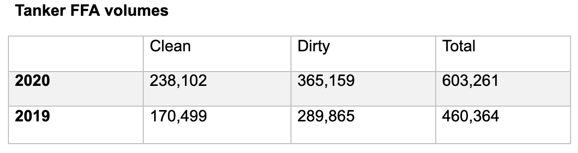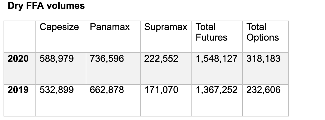 Dry FFA volumes hit 1,548,127 lots, up 17% on 2019. Options trading in the dry market hit an all-time high, up 37% on the previous year to 318,183.