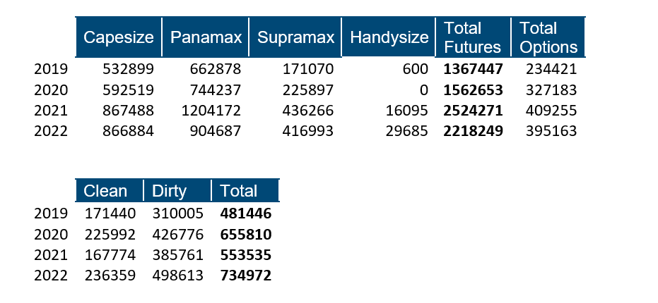 Dry Forward Freight Agreement (FFA) volumes reached 2,218,249 lots, down 12% on 2021. Handysize volumes continued to grow following changes implemented to the Baltic Exchange’s Handysize Index in 2020. Options trading volumes in the dry market were 395,163.