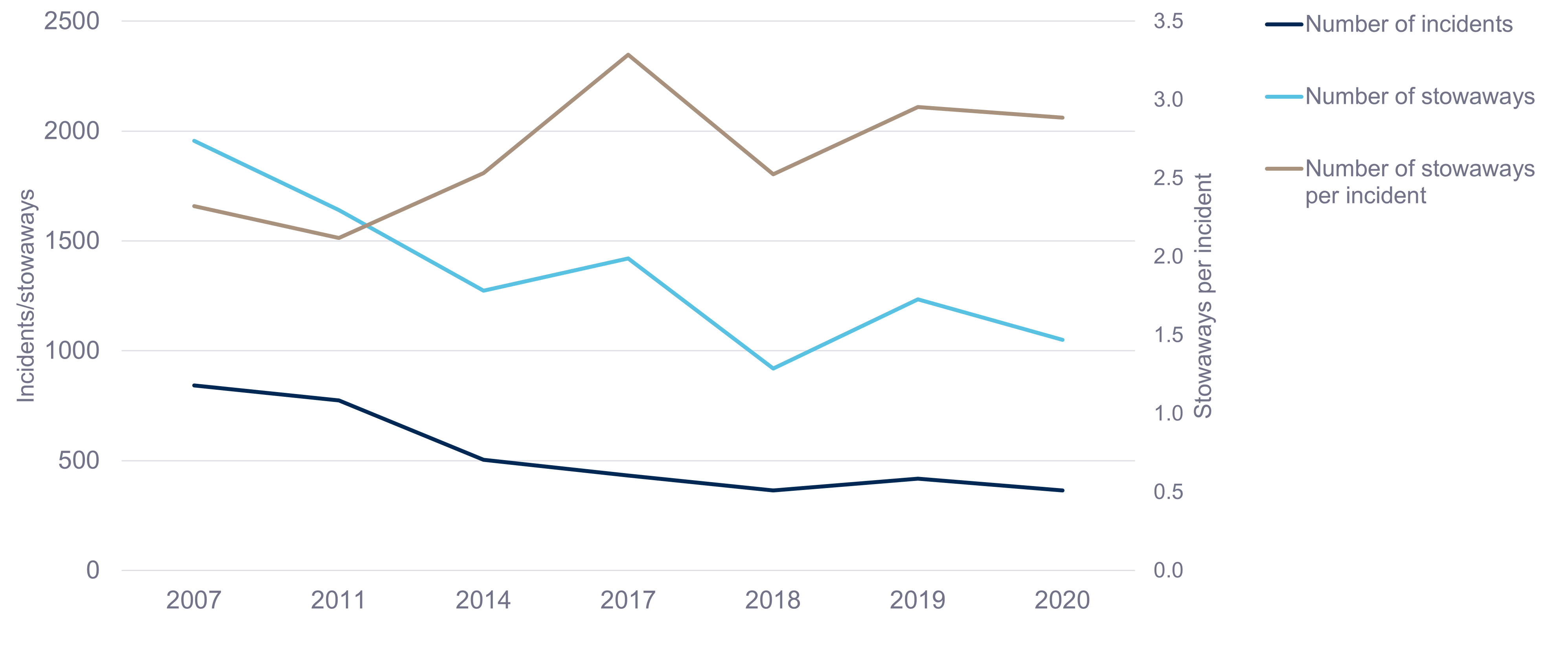 - The total number of stowaways involved has also decreased, but not at the same rate as the incident figures. This means that the number of stowaways per incident has been growing, and the data would seem to suggest that the current average is close to three stowaways per incident.